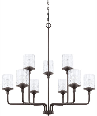 The Colton 9-Light Chandelier in Bronze by Capital Lighting is a stunning centerpiece that breathes new life into any home or office. Its elegant design features a robust bronze finish, which adds a touch of sophistication and timeless appeal to your space. The chandelier's clear water glass shades offer a unique texture and visual interest, creating a beautiful interplay of light and shadow. Each glass measures 6.25 inches in height and 4.5 inches in width, perfectly complementing the overall design.