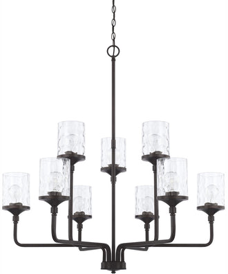 The Colton 9-Light Chandelier in Matte Black by Capital Lighting is an exquisite addition to any home or office, designed to bring a touch of sophistication and elegance to your space. The chandelier features a sleek matte black finish that exudes modernity and class. Its nine arms extend gracefully, each supporting a clear water glass shade that adds a subtle texture and visual interest to the fixture. The combination of metal and glass creates a timeless piece that complements a variety of interior styles, from contemporary to traditional.