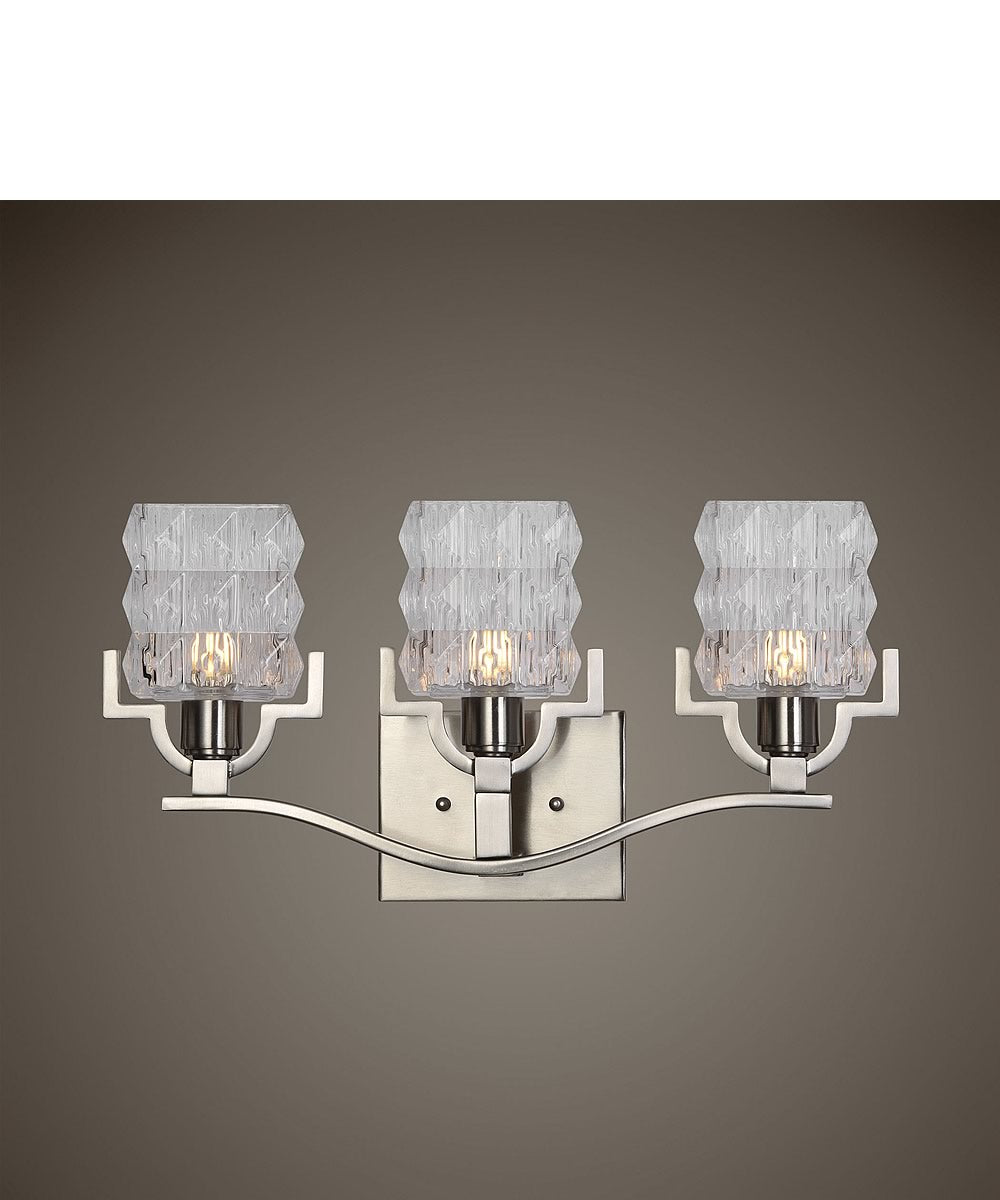 Transitional 3 Lt. Vanity Of Brushed Nickel With Clear Textured Rectangular Glass And Clean Lines. Includes 3-40W G9 Halogen Bulb.Uttermost's Light Fixtures Combine Premium Quality Materials With Unique High-style Design.With The Advanced Product Engineering And Packaging Reinforcement, Uttermost Maintains Some Of The Lowest Damage Rates In The Industry. Each Product Is Designed, Manufactured And Packaged With Shipping In Mind.