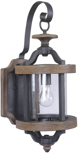 The 23"H Ashwood 1-Light Outdoor Wall Light in Textured Black/Whiskey Barrel finish is a testament to timeless elegance and meticulous craftsmanship. Its cage-like frame, reminiscent of fine wrought iron, coupled with hand-carved wood bands, exudes a rustic charm that complements various architectural styles. The textured black finish offers a sophisticated contrast to the whiskey barrel accents, creating a visually appealing fixture that enhances any outdoor space.