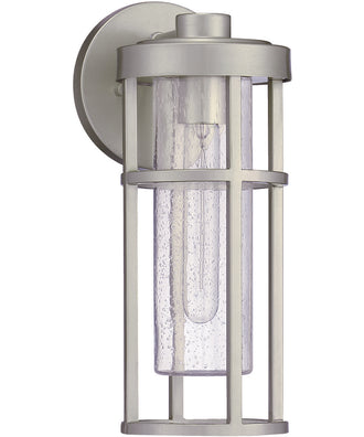 The Encompass 1-Light Outdoor Wall Light in Satin Aluminum is a striking addition to any outdoor space. This light fixture features a strong yet minimal metal frame that exudes contemporary elegance. The satin aluminum finish gives it a sleek and modern look, making it a perfect fit for various architectural styles. The clear seeded glass encases the bulb, adding a touch of sophistication while allowing the light to shine through beautifully.