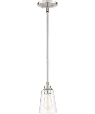 The brushed polished nickel finish offers a sleek, metallic sheen that pairs well with a variety of color palettes. This finish not only enhances the pendant's visual appeal but also ensures durability and resistance to wear and tear. The clear seeded glass adds texture and depth, allowing the light to diffuse softly and create a warm, inviting ambiance.