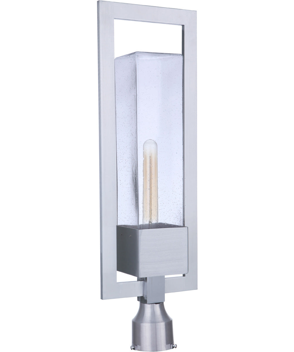 The Perimeter 1-Light Outdoor Post Light in Satin Aluminum is a stunning addition to any exterior space. This outdoor light fixture boasts a modern, clean aesthetic with a contemporary design that effortlessly enhances the look of your home. The light features a clear seeded glass rectangular globe, which is beautifully framed by a striking satin aluminum metal frame. This combination of materials and finishes creates a sophisticated and timeless look that complements a variety of architectural styles.
