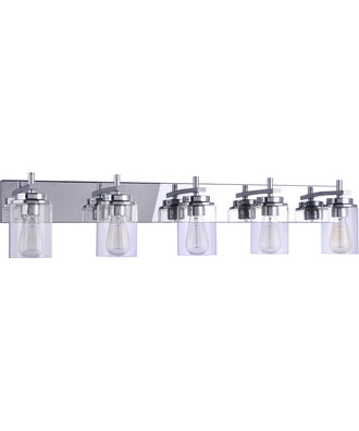 Modern, architectural details combine with clear glass cylinder shades and a smooth wide back plate, to create the Reeves Vanity Collection. Available in two finishes, the Reeves offers your choice of a wall sconce single light up to a 5 light vanity.