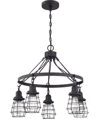 The Thatcher 5-Light Down Chandelier in Flat Black is a stunning blend of fashion and industrial design. Its open-air metal wire shades create an inviting warehouse look that adds a touch of vintage charm to any space. The flat black finish enhances its industrial appeal, making it a versatile piece that complements a variety of interior styles.