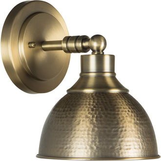 Introducing the 8"W Timarron 1-Light Wall Sconce in Legacy Brass, a true embodiment of industrial chic style. This contemporary showstopper is designed to elevate the aesthetic of any room with its hammered metal shade and visually strong lines. The sconce features a bell-shaped shade that exudes a retro/vintage charm while seamlessly blending into modern industrial and rustic lodge themes. The Legacy Brass finish adds a touch of sophistication and warmth, making it a versatile piece for various interior styles.