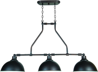 The 32"W Timarron 3-Light Island Pendant Light in Aged Bronze is a stunning addition to any contemporary home. This fixture combines industrial chic style with modern elegance, making it a versatile piece that can enhance various room themes. Crafted from durable steel and featuring hammered metal shades, this pendant light is both stylish and robust.