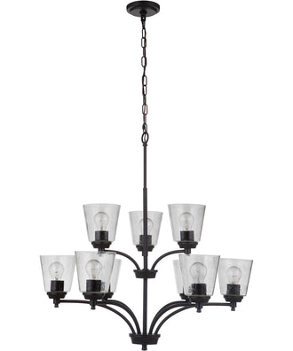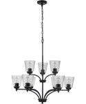 The flat black finish and clear seeded glass shades of the Tyler 9-Light Chandelier make it a versatile piece that can enhance various room themes. It pairs beautifully with modern, industrial, farmhouse, and transitional décor styles. The chandelier's timeless design allows it to blend seamlessly with existing furnishings and décor, making it a versatile choice for any home.