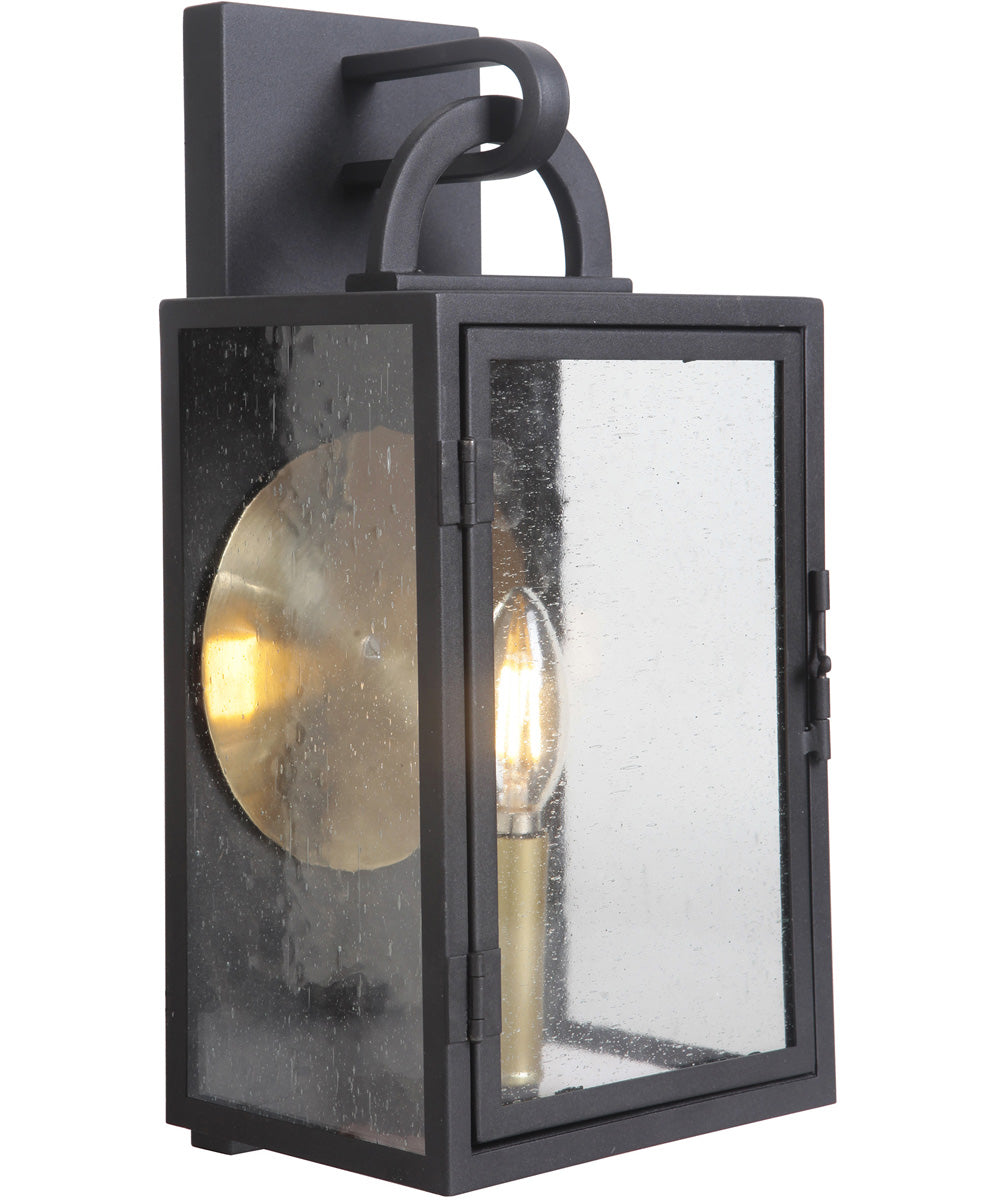 The Wolford 1-Light Outdoor Wall Light in Textured Matte Black is a modern take on the classic candlelight lanterns of yesteryear. This sophisticated outdoor wall light exudes an old-world charm with its glistening candelabra light and reflective plate, casting an inviting glow through its clear seeded glass. Perfect for adding a touch of elegance to your home's exterior, this lantern is both functional and stylish.