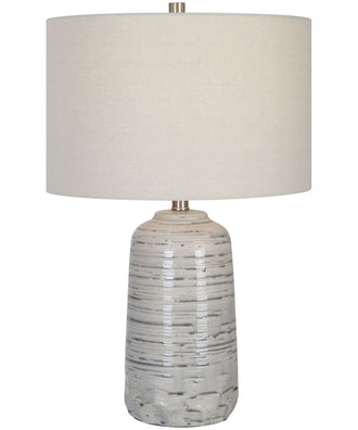 The Cyclone Ivory Table Lamp is a stunning piece that combines traditional elegance with contemporary flair. Its unique shape features a traditional urn body with cut edges at the bottom, creating a subtle yet striking modern aesthetic. The lamp is finished in a sophisticated ivory glaze, accentuated by a heavy striped gray drip pattern that adds texture and visual interest. Brushed nickel-plated accents further enhance its refined look, making it a versatile addition to any decor.
