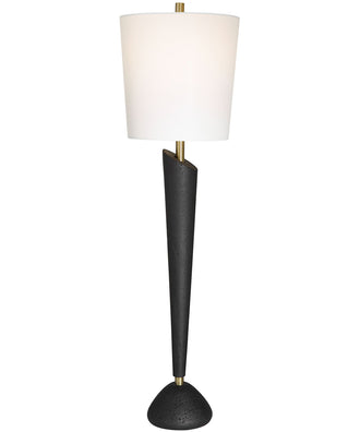 • Features: This futuristic buffet lamp design is made of cast black man-made stone with a noticeable pitted surface, paired with antique brass plated details. the white linen fabric shade is reversed tapered to follow the contour of the lamp base for a unique display.