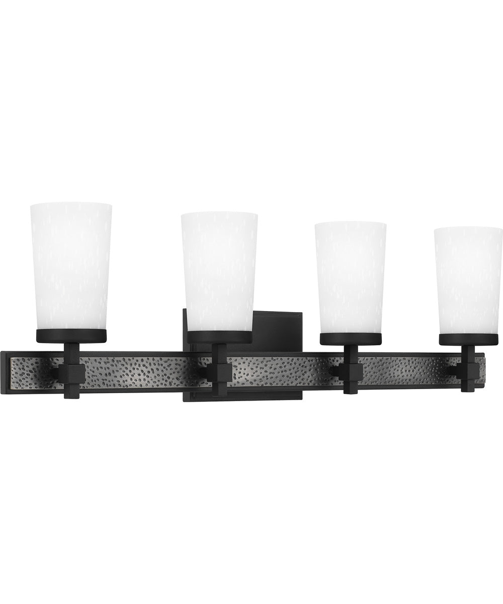 The transitional style of the Dalton collection of bath vanity lights features hints of both industrial and farmhouse design. Etched seeded glass shades sit atop a hammered metal accent bar and a sturdy rectangular backplate. A rich Earth Black finish completes the eye-catching look. Choose from a variety of options in this versatile collection to personalize your bathroom lighting today.
