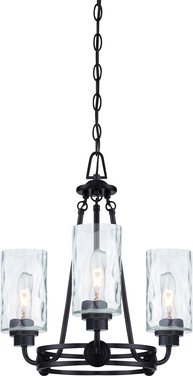 The chandelier features a stunning Old English Bronze finish that exudes a sense of timeless elegance. The dark bronze hue provides a striking contrast against the clear glass shades, creating a visually appealing focal point in any space. The three cylindrical glass shades are meticulously crafted to encase the bulbs, adding a layer of refinement and subtlety to the overall design.
