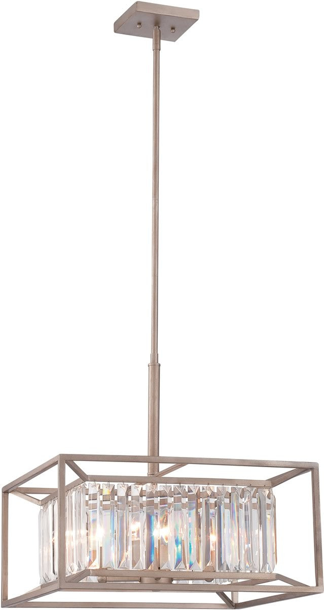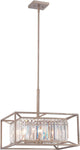 The 19"W Linares 4-Light Pendant in Aged Platinum is a masterpiece of modern elegance. Its sleek, rectangular frame showcases a sophisticated aged platinum finish that exudes timeless charm. The pendant's design features a stunning array of crystal prisms encircling the light sources, creating a dazzling display of light and reflections. This exquisite piece is not just a lighting fixture but a statement of luxury and style, perfect for enhancing any room's aesthetic.