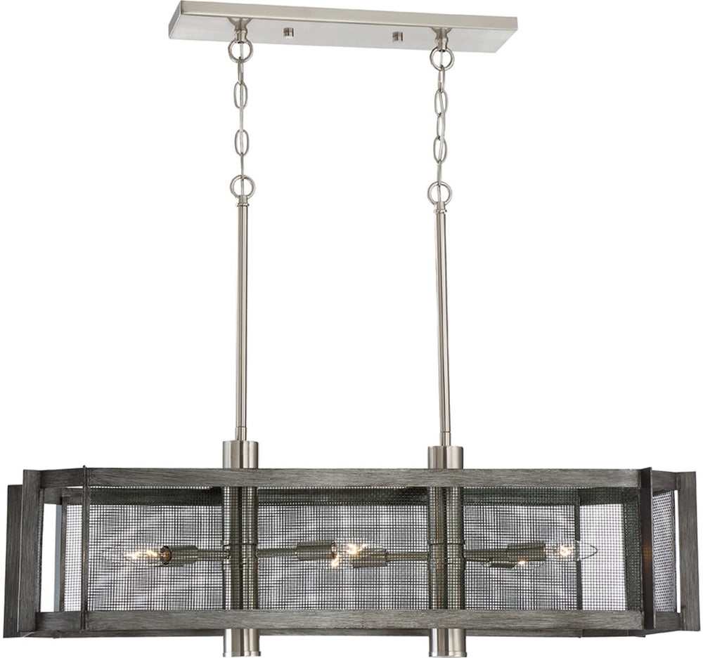 This pendant light features six candelabra bulbs, each capable of holding up to 60 watts, providing ample illumination for larger spaces. The open-frame design allows light to disperse evenly, creating a warm and inviting ambiance. The fixture measures 13 inches in height, 35.75 inches in width, and 13.25 inches in depth, making it substantial enough to make a statement without overwhelming the room. Additionally, the backplate/canopy measures 18.5 inches in width, ensuring secure and stable installation.