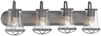 The 30"W Darby 4-Light Bath Vanity in Weathered Iron by Designers Fountain is a stunning addition to any bathroom. Its elegant design features four lights, each encased in a clear glass shade with a subtle seeded texture that adds a touch of vintage charm. The weathered iron finish enhances the rustic appeal, making it a perfect fit for both contemporary and traditional interiors.