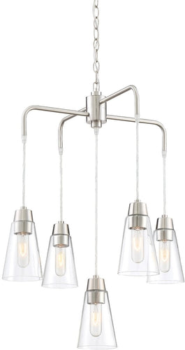 The 23"W Echo 5-Light Chandelier in Satin Platinum is a masterpiece of modern lighting design. With its sleek, contemporary lines and sophisticated finish, this chandelier is sure to be the centerpiece of any room. The satin platinum finish offers a subtle shine that complements a variety of interior styles, from minimalist and modern to transitional and eclectic. Each of the five lights is encased in a clear glass shade, which adds a touch of elegance and allows the bulbs to shine brightly, illuminating your space with a warm, inviting glow.