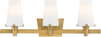 The 24"W Hyde Park 3-Light Bath Vanity in Vintage Gold by Designers Fountain is a sophisticated addition to any bathroom. The fixture boasts a luxurious Vintage Gold finish that exudes elegance and timeless appeal. The sleek, linear design is complemented by three opal glass shades that provide a soft, diffused light, creating a warm and inviting atmosphere.