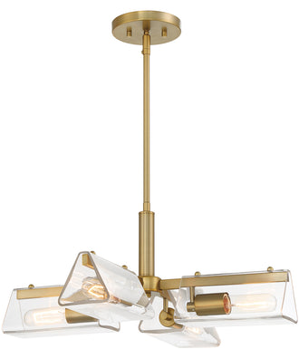 Introducing the Latitude 4 Light Chandelier in Brushed Gold, a masterpiece from Designers Fountain that seamlessly blends luxury with modern aesthetics. This chandelier features a stunning brushed gold finish that exudes sophistication and elegance. The triangular clear glass shades are not only visually striking but also provide a pristine lighting experience, making this chandelier an ideal centerpiece for any room.