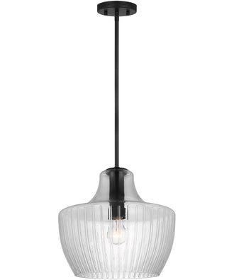 Introducing the Destin 1-Light Pendant by Nuvo Lighting, a perfect blend of modern elegance and timeless charm. This stunning pendant features a sleek black finish with silver accents, creating a sophisticated look that complements any interior décor. The clear ribbed glass bell shade adds a touch of vintage flair while providing ample illumination.