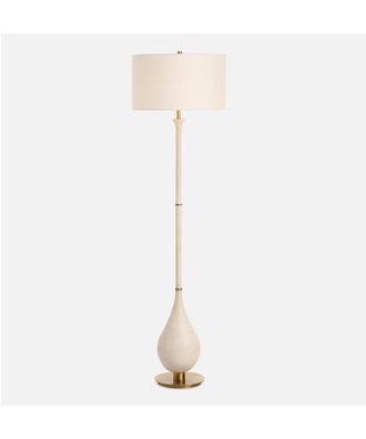 Introducing the Dewdrop Ivory Floor Lamp, a sophisticated lighting solution that seamlessly blends elegance and functionality. This exquisite floor lamp features a teardrop-shaped base crafted from ivory man-made stone, meticulously designed to replicate the luxurious appearance of thassos marble. The base is beautifully accented with plated brushed antique brass details, adding a touch of vintage charm to its modern design.
