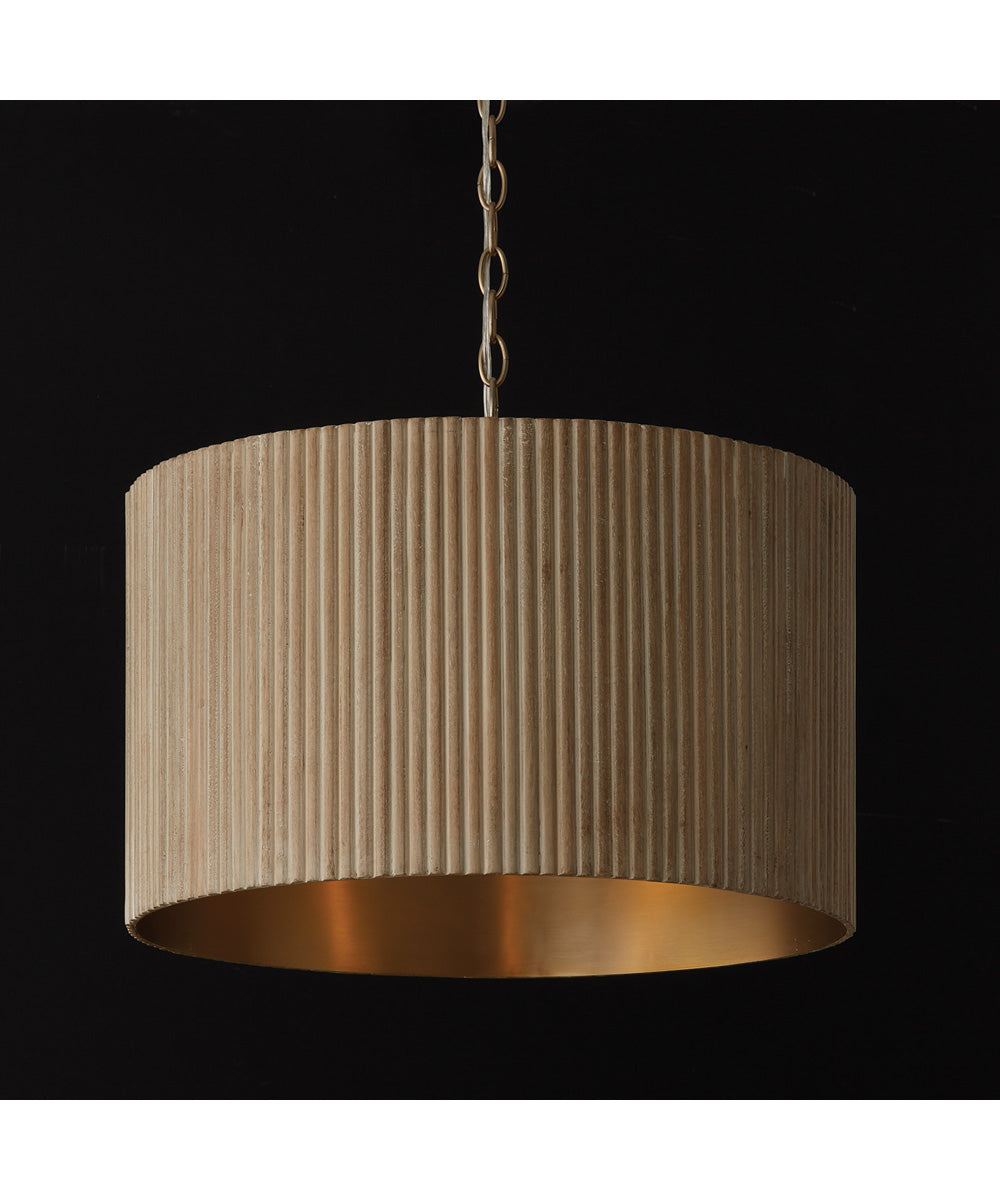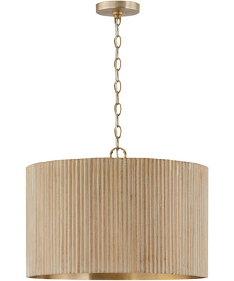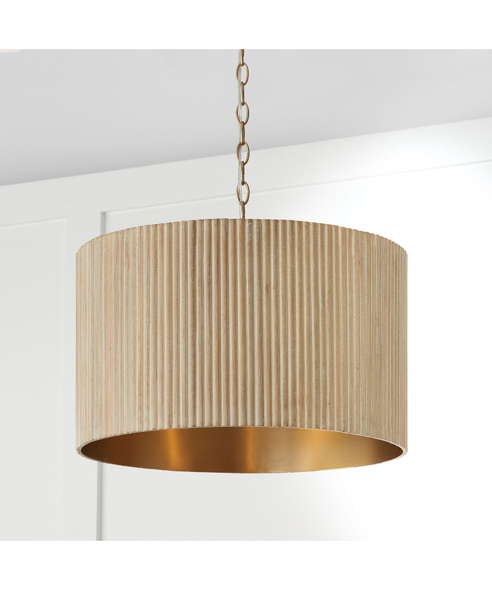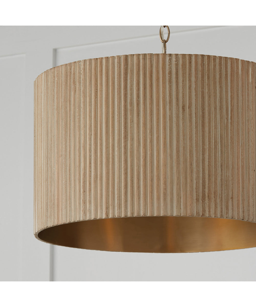 The Donovan 4-Light Pendant in White Wash and Matte Brass is a stunning addition to any home, seamlessly blending artisan texture with mid-century modern style. Its fluted mango wood shade, finished in a delicate white wash, exudes natural elegance, while the matte brass interior adds a warm, inviting glow. This pendant light's mixed-material finish of natural mango wood paired with the slightly muted honey-gold tone of matte brass creates a sophisticated yet approachable look.