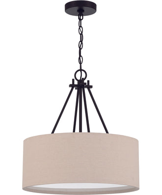 The Duke pendant collection from Craftmade welcomes you with the curves of the crisp linen hardback drum shade complimenting the angular metal frame suspended from up to 6' of chain. The three light pendant available in 18" or 24" with white frost acrylic diffuser delivers warm illumination without the bright glare of exposed bulbs.