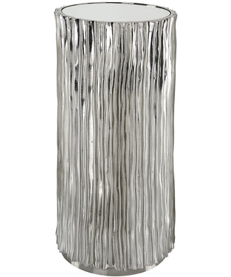 Waterfall textures make a dramatic statement in this petite drink table. finished in polished dark nickel with a mirrored top.