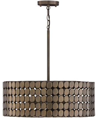 The Eliana 4-Light Pendant in Dark Brass is a stunning addition to any space, offering an elegant blend of modern design and timeless appeal. Its tiered cylindrical silhouette is crafted with unique medallions that alternate to catch the light, providing a captivating shimmer and teasing glimpses of illumination from within. This pendant light is meticulously handcrafted, ensuring a refined and sophisticated look that enhances any room.