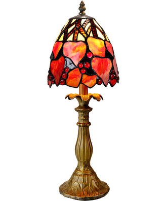 Our bright Estelle Tiffany Accent Lamp adds a dynamic pop of color to any room in your home or office. The neat fixture features a deep dome shade that is crafted of art glass pieces depicting a vibrant fruit tree with brown branches set against a white background. Red art glass gems are nestled amidst red and orange leaves that will glow warmly when Estelle is illuminated. Each glass piece is hand rolled and copper foiled using the same technique first developed by L.C. Tiffany in the late Nineteenth century; please allow for small variations in color as a result. The tree trunk style base is finished in Antique Bronze and features a frond detailed candle cup just below the shade. A perfect size to add eye catching color to a curio shelf, occasional table or vanity, our Estelle Tiffany Accent Lamp will provide you with years of artistically functional lighting.
