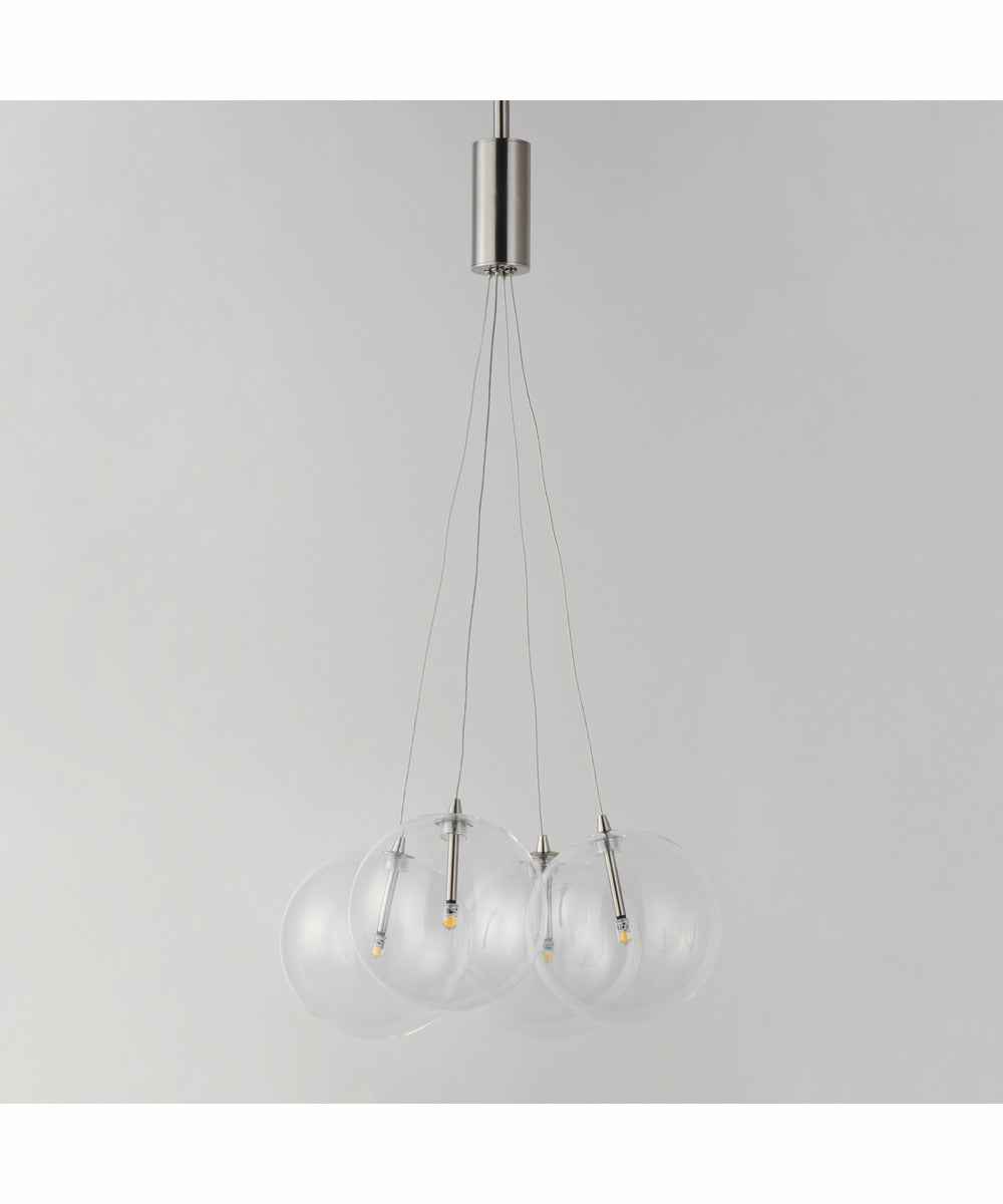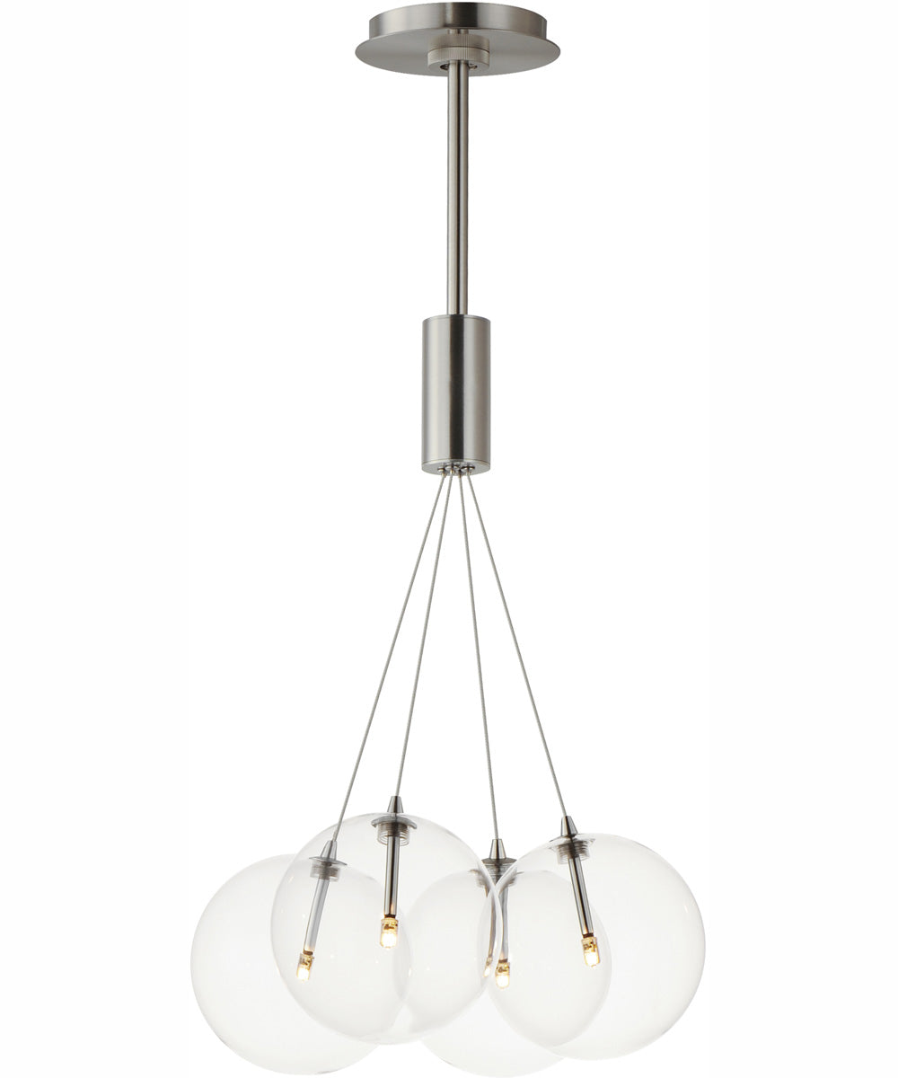 The Burst 4-Light LED Pendant in Clear Satin Nickel is a stunning addition to any modern or transitional space. Its design features clusters of glass globes that vary in size, creating an eye-catching visual effect. The clear glass globes are elegantly paired with a satin nickel frame, giving the fixture a sleek and contemporary look. This pendant light is not just a source of illumination but a statement piece that enhances the aesthetic appeal of any room.