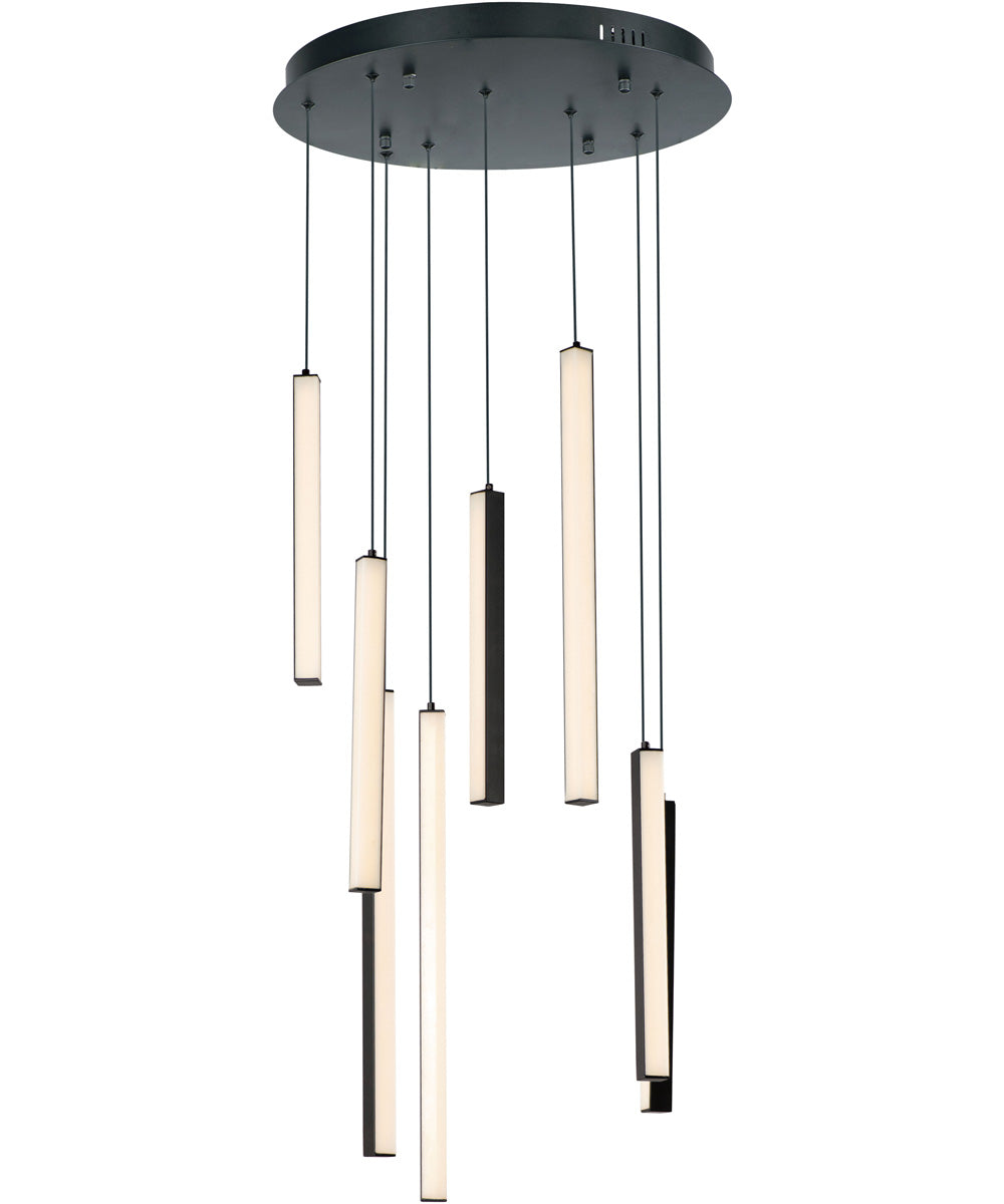 The Hover 9-Light LED Pendant boasts a contemporary aesthetic with its clean lines and geometric form. The black finish adds a touch of elegance and sophistication, making it a versatile piece that complements various interior styles. The pendant's batons hang gracefully from a round canopy, creating a dynamic and eye-catching display that enhances any room's decor.