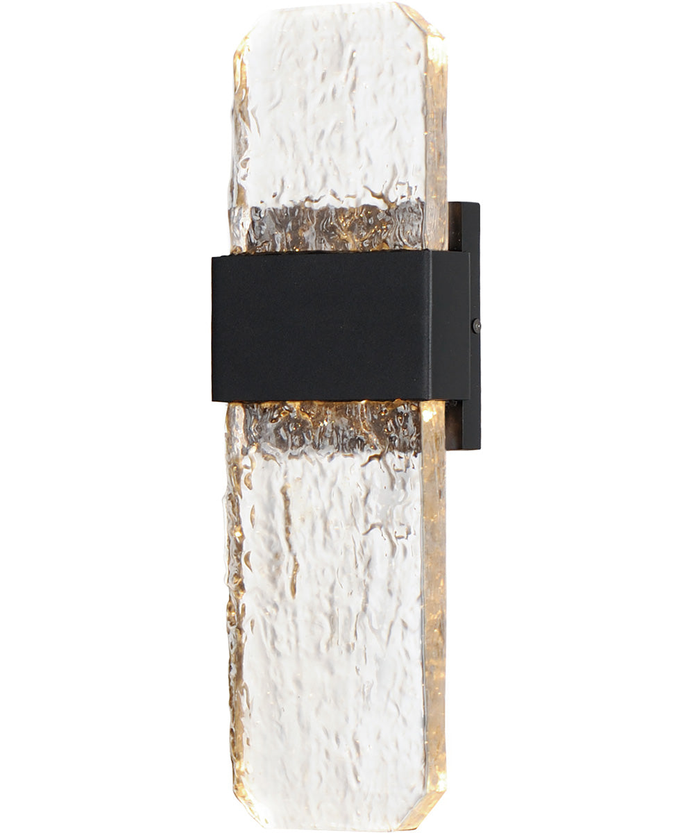 Artisanal cast glass slabs are supported by a Die Cast Aluminum bracket finished in an outdoor rated Black powder coat. Emphasizing the unique beauty of the glasses' imperfect contours, the sconces accentuate these features with concealed LED lighting. Available in 3 size configurations, the sconces provide adequate lighting and showcase the craftsmanship of the artistic glass.