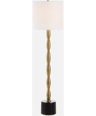 The Ezra Brass Buffet Lamp is a stunning piece that effortlessly combines contemporary design with traditional charm. Finished in a plated antique brass, this lamp is elegantly anchored on a solid black marble base, creating a striking contrast that enhances its visual appeal. The lamp stands at an impressive height of 37 inches, making it a perfect statement piece for any room.