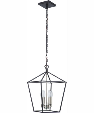 The Flynt II 4-Light Foyer in Flat Black/Brushed Polished Nickel is the epitome of elevated classic style. Its clean lines and substantial frame create a sophisticated silhouette that draws the eye and enhances any space it graces. The sleek candle-style bulbs are elegantly arranged at the center, surrounded by a geometric lantern structure. This combination of modern minimalism and timeless elegance makes the Flynt II a versatile addition to various interior design themes.