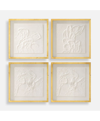 Hand painted abstracts, these elegant pieces of art exhibit thick dimensional texture and an all-white color pallet. a light gold finished shadow box frame under glass surrounds each piece. due to the handcrafted nature of this artwork, each piece may have subtle differences. may be hung horizontal or vertical.