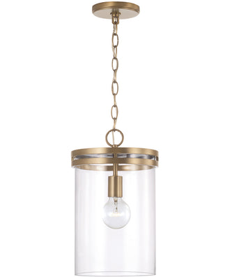 The pendant features a cylindrical clear glass shade that measures 12.75 inches in height and 8.5 inches in width, providing a clean and modern look. The aged brass finish adds a warm, honey-gold hue with subtle black undertones, achieved through a meticulous scouring technique. This finish not only enhances the visual appeal but also gives the fixture a refined, aged appearance.