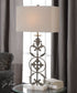 This Updated Look On A Traditional Style Features Hand Forged Iron Showcasing Timeless Flowing Leaf Designs, Finished In A Distressed Aged Bronze With Subtle silver Undertones, Washed With A Rotten Stone Glaze, Accented With A Polished White Marble Foot. The Rectangle Hardback Shade Is A Light Gray Linen Fabric.Uttermost's Lamps Combine Premium Quality Materials With Unique High-style Design.With The Advanced Product Engineering And Packaging Reinforcement, Uttermost Maintains Some Of The Lowest Damage Rates In The Industry. Each Product Is Designed, Manufactured And Packaged With Shipping In Mind.