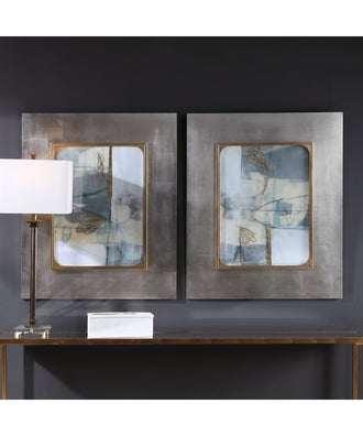 Whimsical Abstract Prints Showcase Light Powder Blue, Deep Charcoal, And Bright Gold Hues. Each Print Is Complemented By A Large Silver Leaf Profile Frame With A Gold Leaf Fillet And Is Placed Under Glass. Artwork By Jennifer Goldberger.Uttermost's Art Combines Premium Quality Materials With Unique High-style Design.With The Advanced Product Engineering And Packaging Reinforcement, Uttermost Maintains Some Of The Lowest Damage Rates In The Industry. Each Product Is Designed, Manufactured And Packaged With Shipping In Mind.