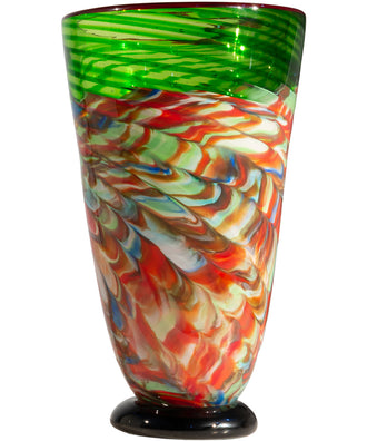Our festive Glasier Hand Blown Art Glass Vase is a bright addition to any room you will proudly display for many years to come. The tall conical vase features a background of translucent green swirls near the top. The balance is a textured swirl of saturated orange, amber, green, blue, and white that continues all the way down to the round black pedestal base. Glacier is hand blown using Favrile art glass, which embeds the color within the glass. This process causes subtle variations in color and texture. Destined to become any room's focal point, our Glacier Hand Blown Art Glass Vase is also the ideal gift for any occasion…or no occasion at all. NOTE: Due to the nature of handmade art glass, colors, sizes and patterns may vary slightly.