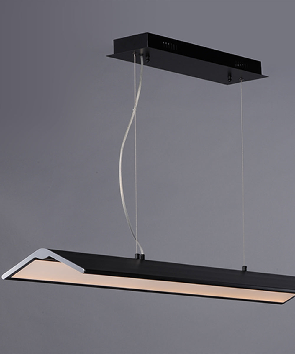 The Glider 46"L 1-Light LED Island Light Fixture by ET2 is a masterpiece of modern design, combining sleek aesthetics with functional brilliance. Its wings are crafted from extruded aluminum, encasing dual edge-lit LED panels that distribute light evenly to the surface below. The Black metal frame, accented with Polished Chrome end caps, creates a striking contrast that adds a touch of sophistication to any space.