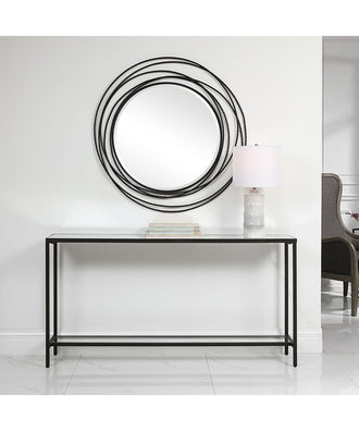 Classic And Minimalistic, This Narrow Console Table In Steel Is Finished With A Streamlined Rustic Black, Inset With A Beveled Mirrored Top, And Gallery Shelf In Clear Glass.Uttermost's Accent Furniture Combines Premium Quality Materials With Unique High-style Design.With The Advanced Product Engineering And Packaging Reinforcement, Uttermost Maintains Some Of The Lowest Damage Rates In The Industry. Each Product Is Designed, Manufactured And Packaged With Shipping In Mind.