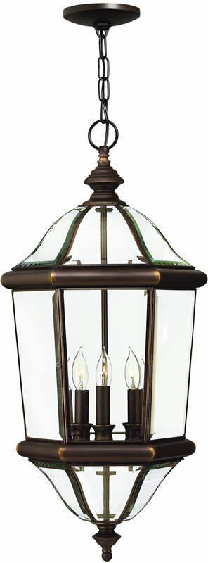 The 13"W Augusta 3-Light Outdoor Pendant in Copper Bronze is a stunning addition to any exterior space. This pendant light showcases a sophisticated design with its round, bent, and beveled glass panels that add a touch of elegance and charm. The copper bronze finish enhances the overall aesthetic, providing a warm and inviting glow that complements various outdoor themes. Its classic lantern shape exudes timeless appeal, making it an ideal choice for those looking to elevate their outdoor decor.