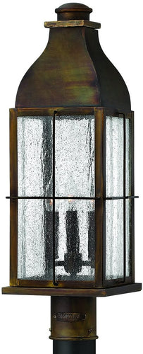 This outdoor post lantern boasts an all-brass construction, ensuring durability and longevity. The Sienna finish adds a warm, rustic touch, blending seamlessly with various outdoor settings. The clear seedy glass panels enhance the lantern's antique appeal while providing a subtle diffusion of light that creates a welcoming ambiance. This combination of materials and finishes not only looks beautiful but also withstands the elements, making it ideal for wet locations.