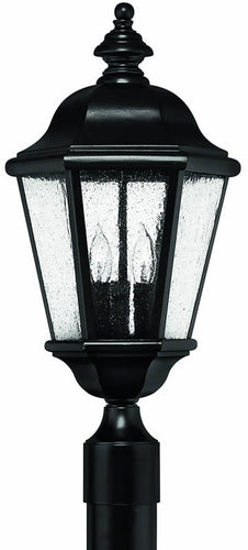 The 21"H Edgewater 3-Light Large Outdoor Post Lantern in Black is a perfect blend of classic elegance and modern functionality. Crafted from high-quality cast aluminum, this lantern boasts a robust construction that ensures durability and longevity. The black finish adds a touch of sophistication, making it a versatile addition to any outdoor setting. Its clear seedy glass panels not only enhance its visual appeal but also provide a warm and inviting glow, creating an enchanting ambiance in your garden, driveway, or patio.