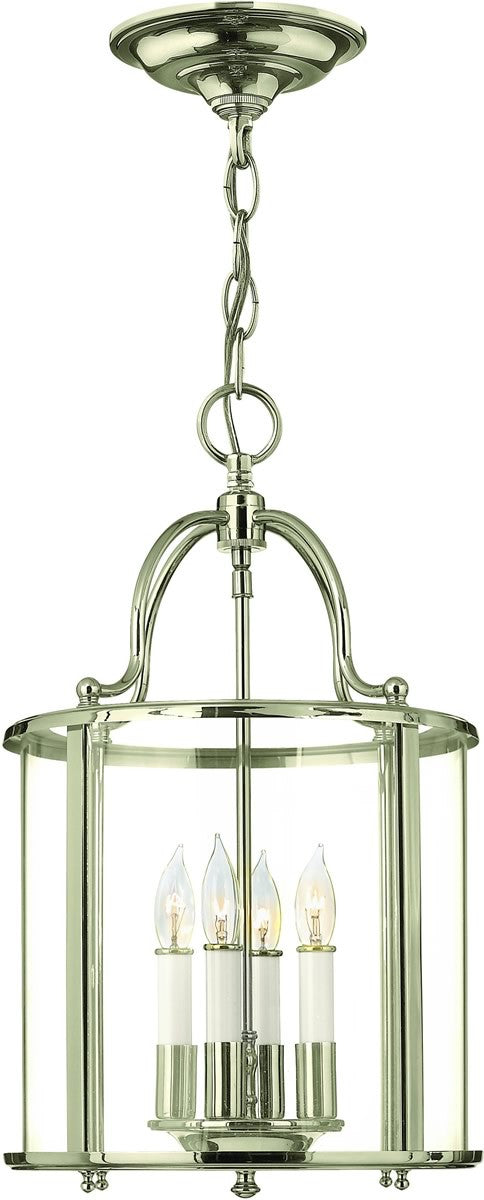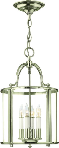 This 4-Light Chandelier by Hinkley features an/a Polished Nickel finish. Gentrys traditional design is offered in four classic finishes, Olde Bronze, Pewter, Heirloom Brass, and Polished Nickel. The clear bent glass panels, white candle sleeves and coordinating candle chasers add classic elegance to this timeless style.