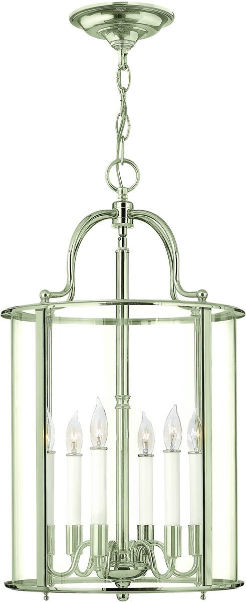 Introducing the 14"W Gentry 6-Light Chandelier in Polished Nickel, a stunning piece from Hinkley's Gentry Collection. This chandelier exudes classic elegance with its traditional design, making it a perfect addition to any sophisticated interior. The polished nickel finish provides a sleek and shiny appearance, enhancing the overall aesthetic appeal of your space. The clear bent glass panels encase the chandelier, allowing the light to shine through beautifully while adding a touch of refinement.
