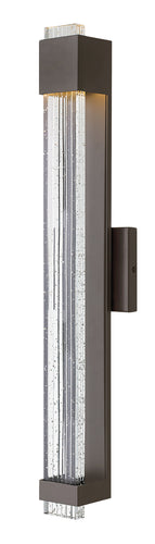 The 28" Glacier 1-Light Large Outdoor Wall Light in Bronze is a stunning blend of industrial and contemporary design elements, creating a breathtaking silhouette that adds a touch of sophistication to any outdoor space. The sleek bronze finish on the powder-coated aluminum frame provides a modern yet timeless appeal, making it an ideal choice for various architectural styles. Its substantial block of clear seedy glass with etched grooves not only enhances its aesthetic appeal but also brilliantly channels light, creating a mesmerizing visual effect.