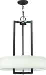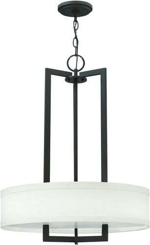 This 3-Light Chandelier by Hinkley features an/a Buckeye Bronze finish. Hampton is a modern transitional design, offering the ultimate in urban sophistication. The minimal rectangular frame, paired with a decorative acrylic etched bottom lens, is softened by a contemporary off-white linen drum shade.