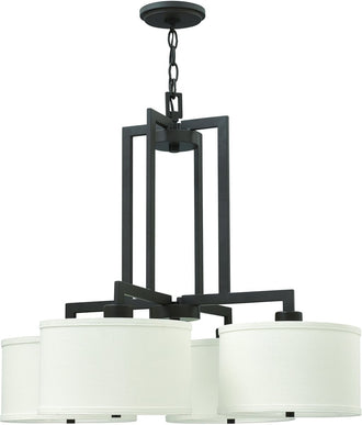 This 4-Light Chandelier by Hinkley features an/a Buckeye Bronze finish. Hampton is a modern transitional design, offering the ultimate in urban sophistication. The minimal rectangular frame, paired with a decorative acrylic etched bottom lens, is softened by a contemporary off-white linen drum shade.
